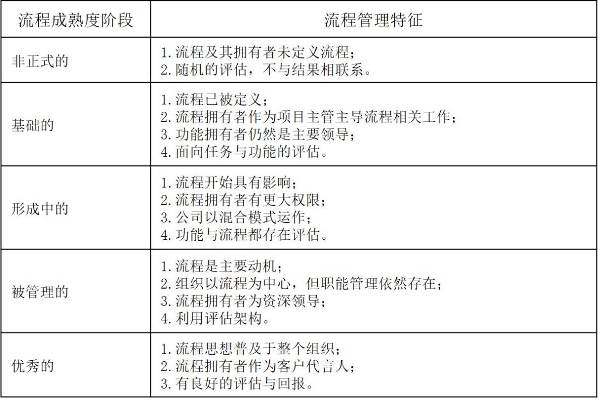 知名咨询公司。以IBM、埃森哲为代表的知名咨询公司,也有自己专用的流程成熟度模型。以埃森哲为例,其将流程成熟度分为五级,等级与特征如下所示: