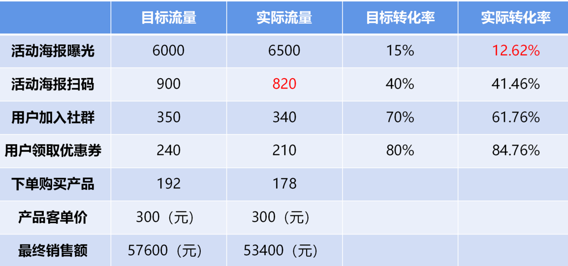 通过上面这张表,我们可以看到,社群活动海报扫码这个环节实际完成情况是低于目标转化率的,而我们假设这一步的转化率能够达到目标值15%,很容易就计算出最终的销售额是可以超额完成目标的。