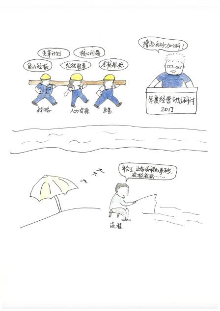 一边是热火朝天,共商企业发展大计;一边是悠然自乐,沉溺于流程小世界。这幅漫画是对企业流程管理部门的警示。