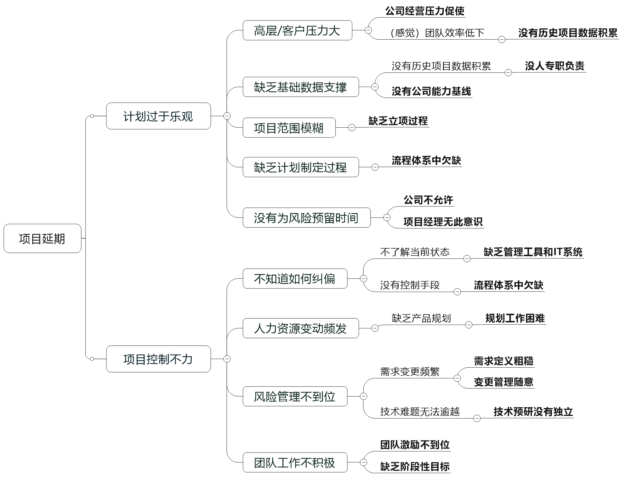 引起项目延期的原因被逐层分解,最末端的就是根本性原因。