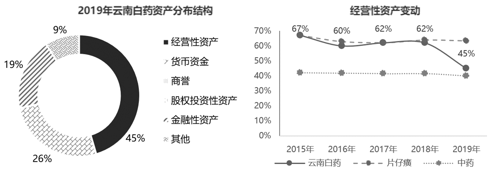 2019年,公司总资产中有45%为经营性资产,26%为货币资金,19%为金融性资产,1%为股权投资性资产,0%为商誉;2019年,公司经营性资产占比45%,行业平均为65%,对标企业为40%,公司经营资产总资产占比明显低于行业平均水平,同时2019年公司经营性资产占比较前四年平均值下降18个百分点。其实除2019年外,云南白药历年的经营性资产占比都在60%左右,而2019年云南白药经营性资产占比突然大幅下降主要是2019年公司的货币资金巨额增加,从而引起公司的资产总额有较大幅度的增长。货币资金的大额增长一方面是公司2019年进行了同一控制下企业合并;另一方面与公司有大量的金融资产到期收回现金相关。