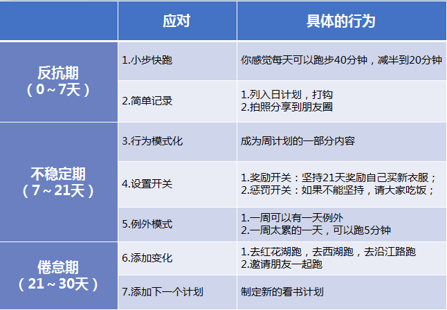 我们在这三个阶段使用7个小技巧,就能够比较好地确保一个习惯的形成,下面我们以形成简单运动的习惯举例,如表7-1所示。