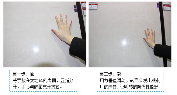 水倒在砖正面让顾客用脚蹭,测试防滑性能,水倒在砖背面根据速度可以测试吸水率,吸收越快越好