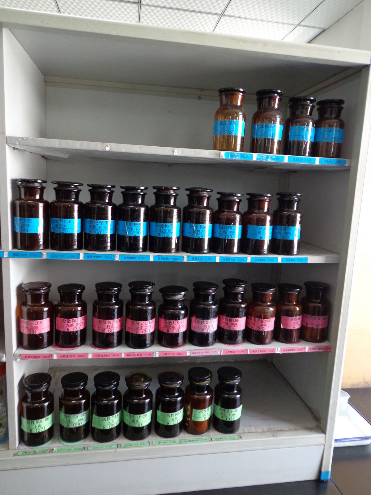 下图不同的色标代表着不同的溶剂,方便查找、减少出错。6S管理规范化带来的不仅是美观,关键是不容易出错。