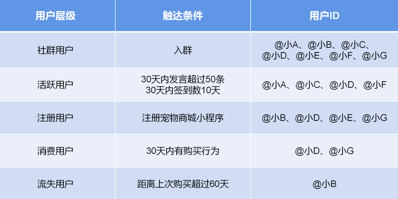 同时,对每个层级用户给出明确的用户行为字段。这样可以让我们知道每个用户所处层级状态,以及明确找到如何提升宠物社群交易的具体方向。
