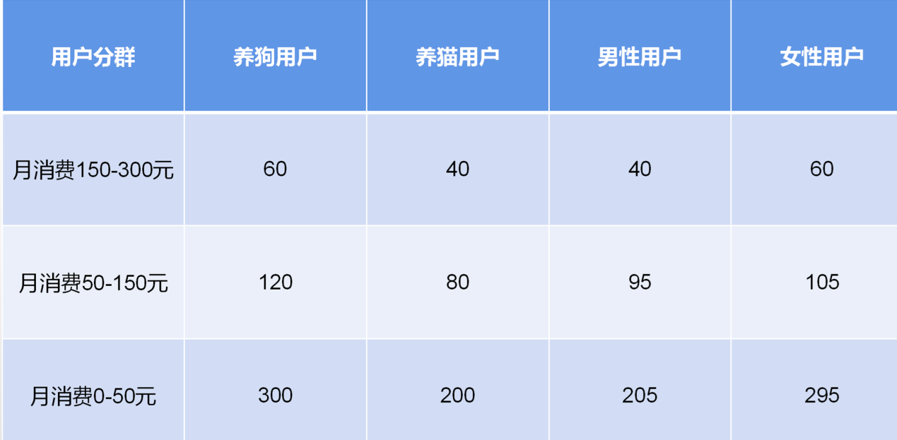 以案例中宠物社群进行说明,主要围绕着付费用户这一层进行用户分群,主要依据包括消费金额、养宠品类、用户性别者三个维度进行横向区分,如表11-10所示。