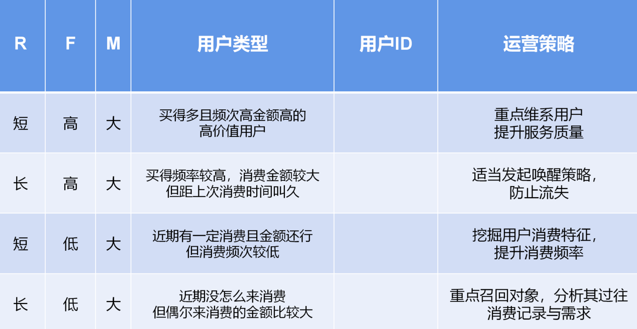 当收集完用户数据之后,就需要开始对这些数据进行分析。针对宠物类社群而言,我们主要运用到用户分层数据分析、用户分群数据分析、用户RFM价值数据分析以及用户忠诚度数据分析(具体的分析方法可以参考上一节,这里直接放结果)。