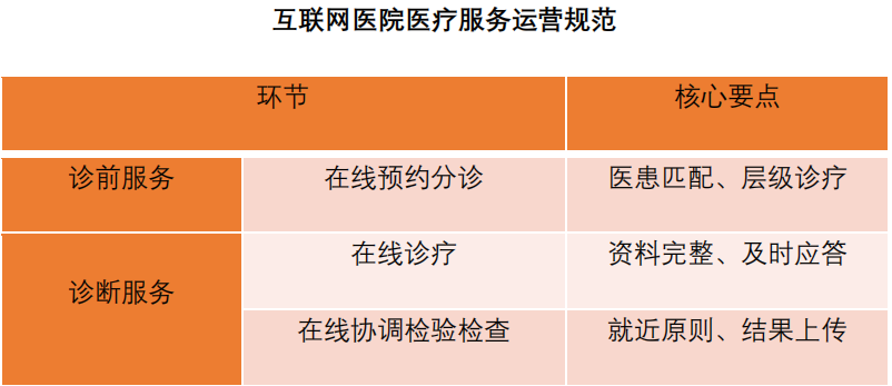 目前已有的互联网医疗服务运营规范主要覆盖诊前服务、诊断服务、开方服务、药品服务、住院服务等环节,还缺乏规范细则,我们将资料进行了总结,如表2-2所示,供大家参考。