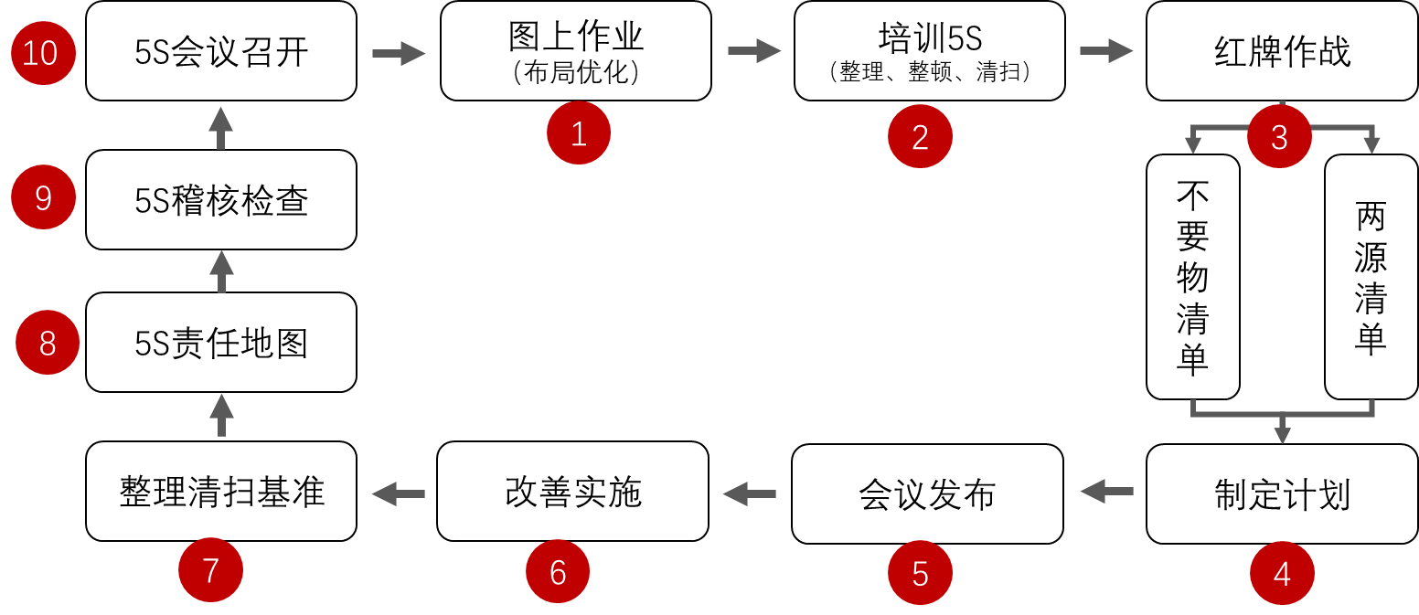 在开展现场改善的时候,一切的5S改善活动都要和浪费、效率、品质改善等挂钩,要让员工和公司高层都必须了解到现场开展的5S改善活动是和员工的切身利益挂钩的,是能够真实的计算出效益的,这样员工的参与度才会更高,高层的支持度也会更高。当一切的5S改善活动都是以效率、品质为基调的时候,改善的收益、改善的氛围、改善的成果才会越来越大。