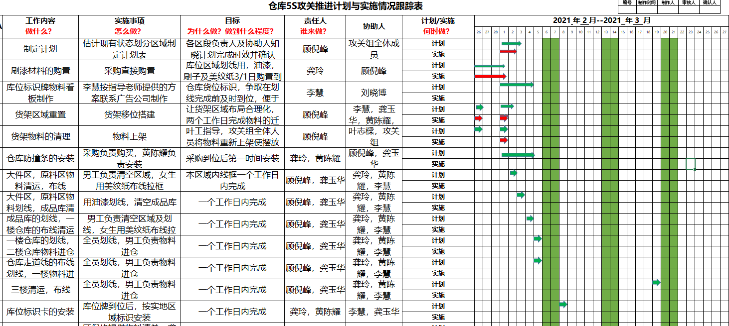 通过红牌作战贴出来很多的问题点,这些问题点就是接下来以组为单位进行全员改善的内容。通过制定计划,让班组长学习掌握甘特图制作的核心内容和转动PDCA的逻辑,培育班组长制定计划的能力。一个完整的计划能够显现出班组长日常工作安排的是否恰当。