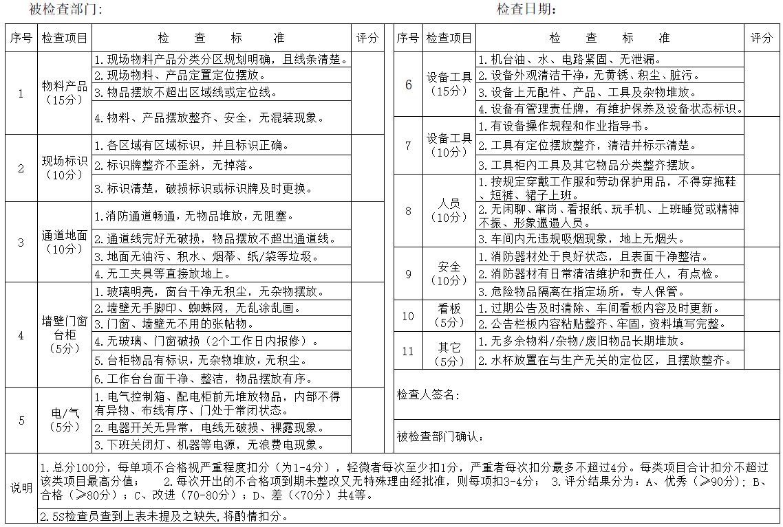 拟定了责任地图之后,如果缺乏一定的检查评比机制的话,即使确定了区域责任,也难以按照标准进行维持。美国IBM公司总裁郭士纳曾说:“人们不会做你希望的,只会做你检查的,如果你强调什么,你就检查什么,你不检查就等于不重视。检查与考核是企业管理中的一对孪生兄弟,只检不考,缺乏力度;只考不检,失去行使依据。强有力的检查与考核。是推进企业5S管理执行力的锐利武器。同时,检查又是考核的基础,为考核提供了信息和数据,为考核的公平和公正提供事实依据。员工永远只会做检查的事情,嘴上要求万遍,不如行动检查一遍,没有检查,就没有现场5S改善的执行力。