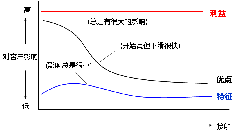 对客户而言,最关心的一定是得到的利益,第二是优势,最后才是特征。好广告不会纠缠产品的特征,而是直击客户想要的结果——带来什么好处?解决什么问题?比如有一个广告让大家印象深刻,叫作《今天做人流,明天就上班》,直击目标用户想要的结果,明天就上班!人流是心病,怕就怕拖拖拉拉,怕被大家发现,怕耽误工作。如果换一种说法——《最高超德国人流技术》,只讲特征效果就差太多了。随着销售的进展,FAB对客户影响力发生了不同变化(见FAB与销售周期图),利益对客户的影响在整个销售周期中最大且很平稳。优势在开始有较大的影响力,但随着销售进展很快下滑,而特征的影响力在整个销售过程中始终处于很低的位置。
