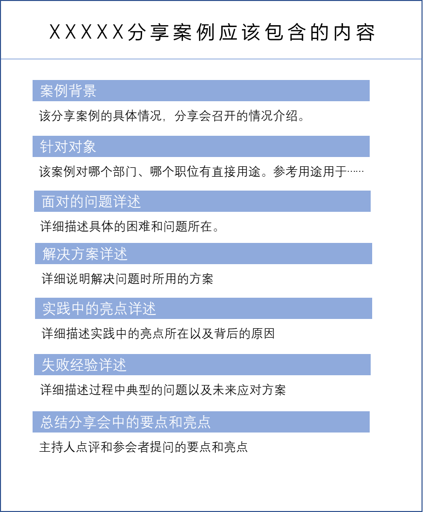 分享案例的要点可以包括很多内容,诸如工作流程的关键点、工作节点的关键点、注意事项、例外处理等等,根据每个项目/事件不同的情况,总结分享会案例可长可短,一般而言,案例包含下图中的内容会更加易读: