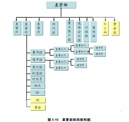 直营部由4~6个直营营业所组成,并配备级别较低的通路企划组、训练组、查核组及MS科、物流组、营会组等单位,具体架构如图5-10所示。