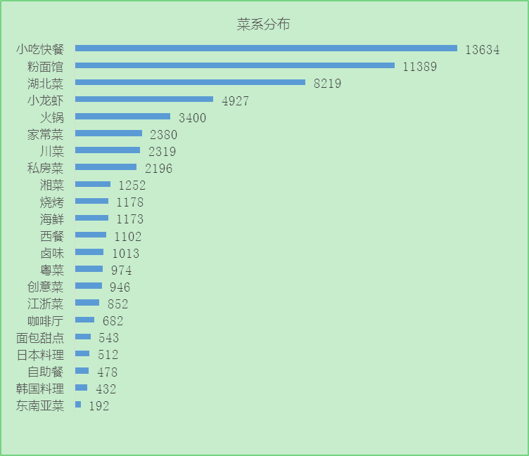 在菜系门店分布中,小吃快餐、粉面馆占比42%,说明主要以日常就餐为主;湖北菜、小龙虾、火锅占比达到27%,这是消费者重要的就餐场合,