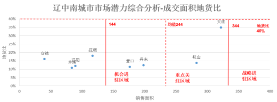 市场潜力从成交面积和地货比两个维度考虑,地货比较低且成交面积较大代表市场潜力较大。战略进驻区域城市无;重点关注区域城市共1个,分别为鞍山;机会进驻区域城市共2个,分别为营口、丹东。(沈阳商品住宅面积为1489万平方米,地货比为55%)