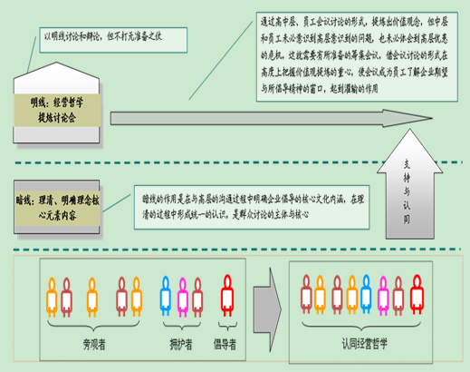 尽管可以用“明线”和“暗线”对经营哲学的具体内容进行确定。但是,有了经营哲学,并不代表已经完成了工作,还必须将经营哲学的理念渗透到企业的方方面面,真正发挥经营哲学的引导作用,这就涉及如何将经营哲学落地。