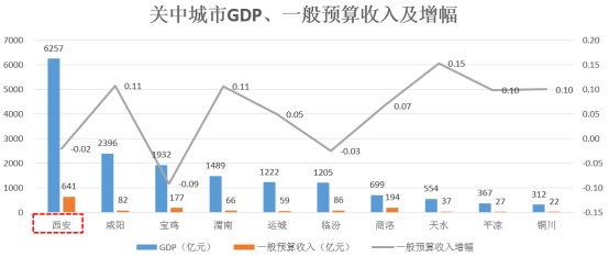 关中城市群10个城市中GDP超过均值1643亿元的共有3个,其中、超过5000亿的1个,为西安;一般预算收入的均值为139亿元,高于均值的城市共有3个,分别为西安、宝鸡、商洛。