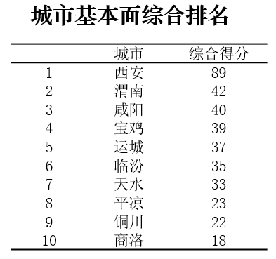 关中城市群城市基本面综合排名TOP3的城市为:西安、渭南、咸阳。处在城市发展较好区、适中区、较差区的城市个数比为3:4:3。