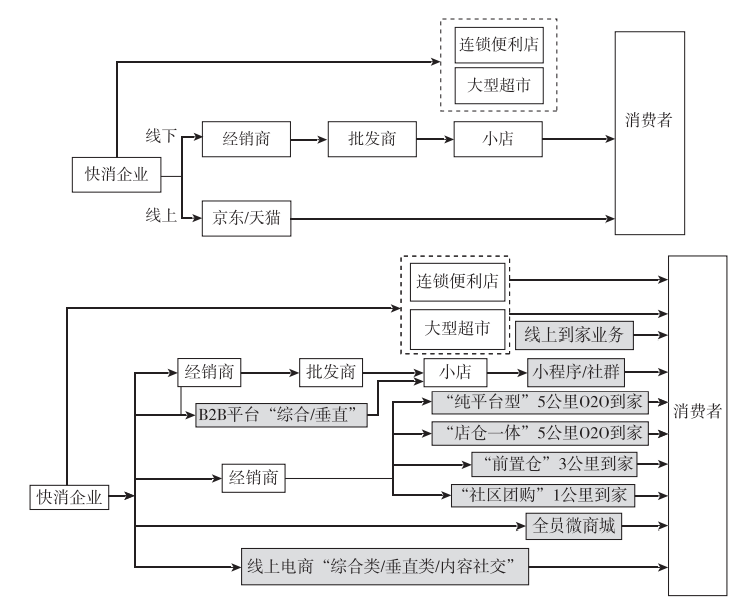 作为科特勒经典营销4P理论中唯一不被厂家主动掌控的一个“P”(Place),渠道都是充满竞争和不断变化的各路厂家必争之地。对快消品从业者而言,现在的卖货渠道越来越多,并且与消费者的距离越来越近。过去传统的快消品行业业态特性是线性不离散,各品牌扎根各物理售点做深度分销;现在则是越来越分散,各个新老渠道与消费者的触点越来越多,几乎每个触点都有可能成为一个售点。如图2-16所示。