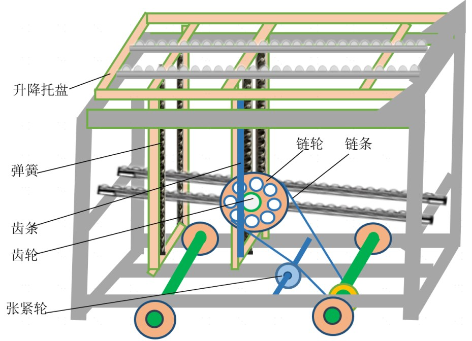 当料箱放置在黄色托盘上,料箱的重力会使齿条向下移动,齿条带动齿轮转动,齿轮与链轮啮合,进而推动整个台车前进,完成送料。当料箱在目的地被取走后,弹簧的反作用力使齿轮齿条反向运动,链轮随之反向旋转,齿条上升,台车便自动返回。