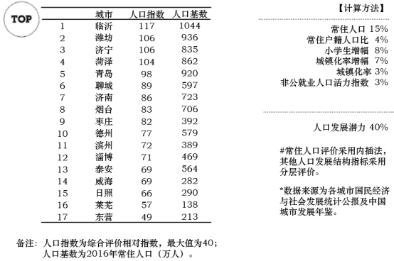 山东半岛城市群人口基数及发展潜力较好,17个城市人口基数均值为582万。人口指数TOP3城市为:临沂、潍坊、济宁