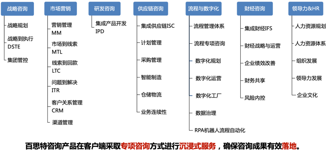 百思特咨询基于对企业发展阶段、行业特性和标杆的持续研究,形成了企业端到端、全价值链的解决方案咨询服务。