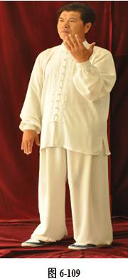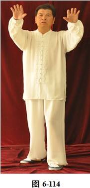 注意:单鞭在整套拳架中,起着承上启下的作用,应该注意中正。上身不可前倾,肩背不要倾斜。要呼吸自然,如欲左顾,则眼神领先于左顾; 欲右盼,则眼神领先之右盼。总之,要做到处处神意领先, 才能做到意到气到。