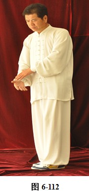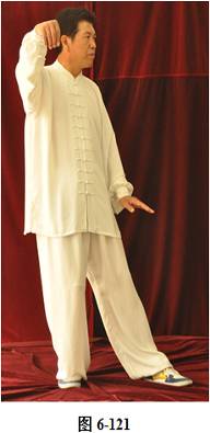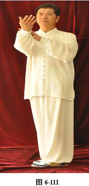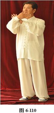 接上式,挤出后,右腰上提往左旋转,身体随向左转动,眼神也随之向左看。挤式不变,跟随身体也向左转至正南 向上方穿掌, 右脚也随之内稍转。腰微拱,穿掌的两臂顺势向下採,重心移至右腿成微后倚。腰向右外旋转,身体侧向西北,两臂也随之翻转向右后, 两掌指尖斜指向地面两掌心朝下。左手臂置于右小腹,右手臂置于右胯外侧舒伸直。左腰上提,左脚外开脚尖朝向正南,与左肩平行;右腰同时上提,带动两臂向上划弧摆向正南,成左弓步。腰向左外撑, 两臂随腰向左外划弧。腰随之后拱重心移至右腿,两臂继续向下划圆,左手向里旋转手心向上,随重心转移后坐收之腹前,两掌相对合在一起(见图6—108至6-122)。腰微含旋转向右,两手相合的双肘也随之微转稍斜向西北,打出右边肘;腰回转微含,随之上提,右臂顺势向右外上方打开,右掌变勾手向右上方平送,略高于右肩。左手仍置胸前,左腰微拱,向左外转,身体转向东南,随即提左膝,左脚向左前上方迈出一步,脚尖朝向东南, 右脚随左脚内转朝向东南。左腰继续上提,左臂随之向前掤出,成左弓步。腰微拱身体稍后坐,掤出左手顺势内旋翻,掌心向下採按至腹前。腰随即上提左掌顺势向左前上方推出。
