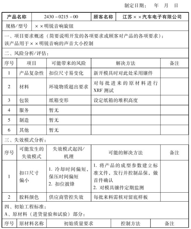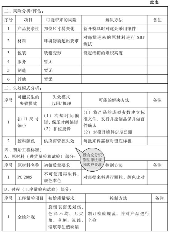产品保证计划一般由研发工程部主导制作,APQP成员要参与评审,主要作用是识别从原材料到成品出货的每个阶段存在的主要风险以及初步管控设想,同时这也是FMEA和控制计划的基础。