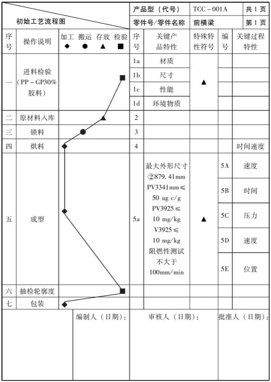 根据过程设想、质量目标、设计目标,制定初始的工艺流程图设想,这个设想一旦成型,工程部门就要准备制样的工装与设备。对初始流程图不做特别要求。参见表1-2-3。