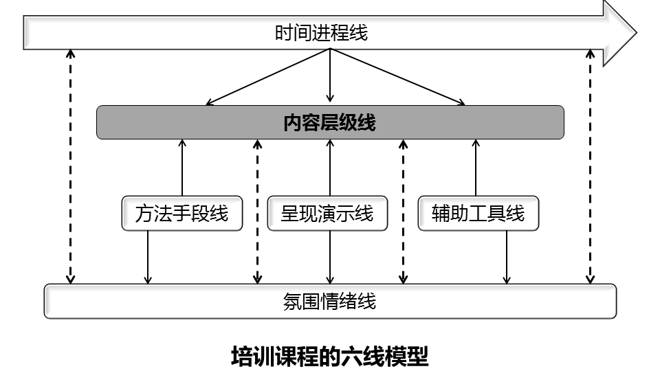 作为培训师,在进入实质性的课程设计与开发之前,有必要从整体上了解、把握一堂培训课程的六条线索,我们称之为“培训课程的六线模型”(如图2-2所示)。