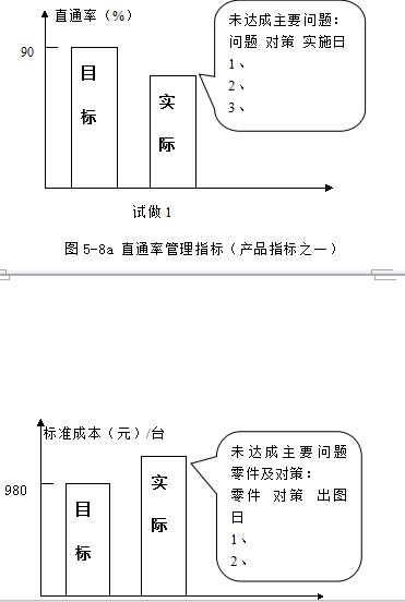 项目推进过程中的进度管理和管理指标达成度管理最常用的方法是采用管理看板。将管理指标、推进计划、日程表等集中张贴在一大看板上,每次确认会将实际完成状况在看板上标注,这样不论谁都能明白实际进度(或管理指标)同计划(或目标值)的差异。若无特别的意料之外的原因,必须在计划内完成任务(或达成目标值)。为在计划时间完成任务,对于新产品开发项目组成员来说,加班加点是很平常的事,这一点不论是欧美企业、日本企业还是我国东南沿海企业莫不是如此。图5-8为直通率管理指标图,表5-1为生产准备目标值,表5-2开发大日程表,5-3为设计出图的大日程表,表5-4详细设计月度出图日程表。