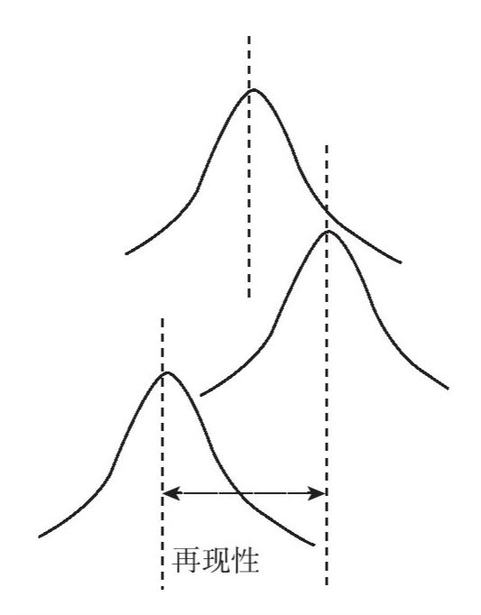 不同的人、用同一种仪器,重复测量多次同一产品同一个特性,因测量结果不一样而导致的误差,就是再现性变差。参见图3-1-5。