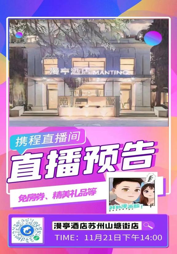 直播前做好直播间预热,提前分享直播间到酒店私域。比如:通过视频、推文、海报等(推荐海报)等分享形式,引导微博、公众号、朋友圈、社群等目标人群预约直播间。