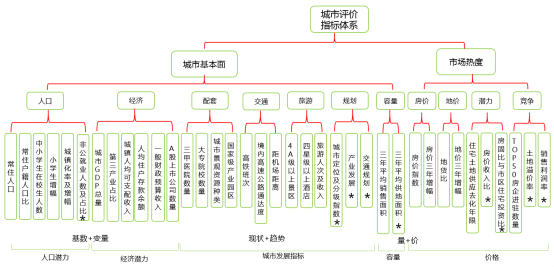 我们对5大模块,11个一级指标和40个二级指标进行了分析归类,将人口、容量、经济、配套、交通、旅游、规划等7个一级指标纳入城市基本面维度,将房价、地价、潜力和竞争等4个二级指标纳入市场热度维度进行综合分析。从而构建起二个维度、一级评审指标、二级评价指标三个层次的总体评价体系框架。