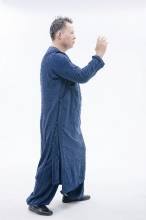 1.左前虚脚尖向左侧旋开90度,右脚踩下,缓缓起身将重心平移至左脚心。左脚底往下踩 ,带动腰胯将右脚尖向左旋与左脚成90度,同时右吊手落于右脚旁,双手心相对,上半身落胯前倾15度。