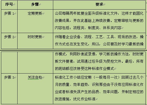 在优秀的企业,工作是按标准开展的,因此,标准必须是最新的,是当时正确的操作情况的反映 |