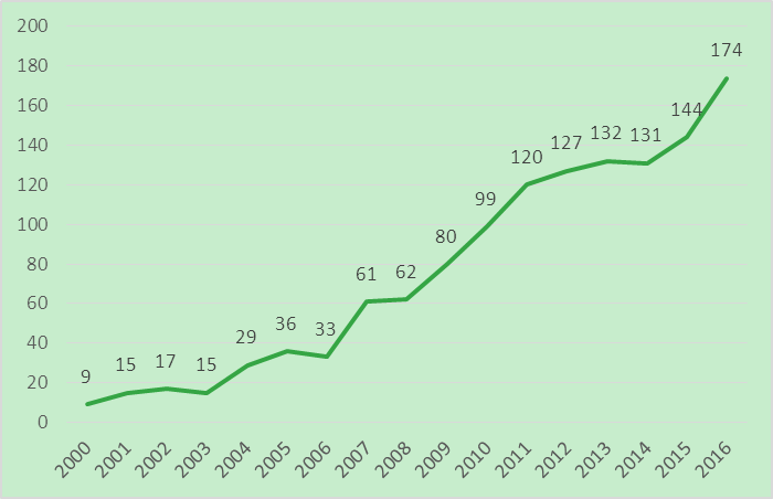 越来越多的本土药企通过海外投资并购、海外建厂、设立分公司和研发机构、专利授权与转让、创新药海外多中心临床等方式参与国际市场竞争。从图5-2可以看出,2000—2016年,中国药企与国外药企之间的交易合作数量显著上升,年平均增长率为19%,2016年几乎每三天就会有一次中外药品交易。