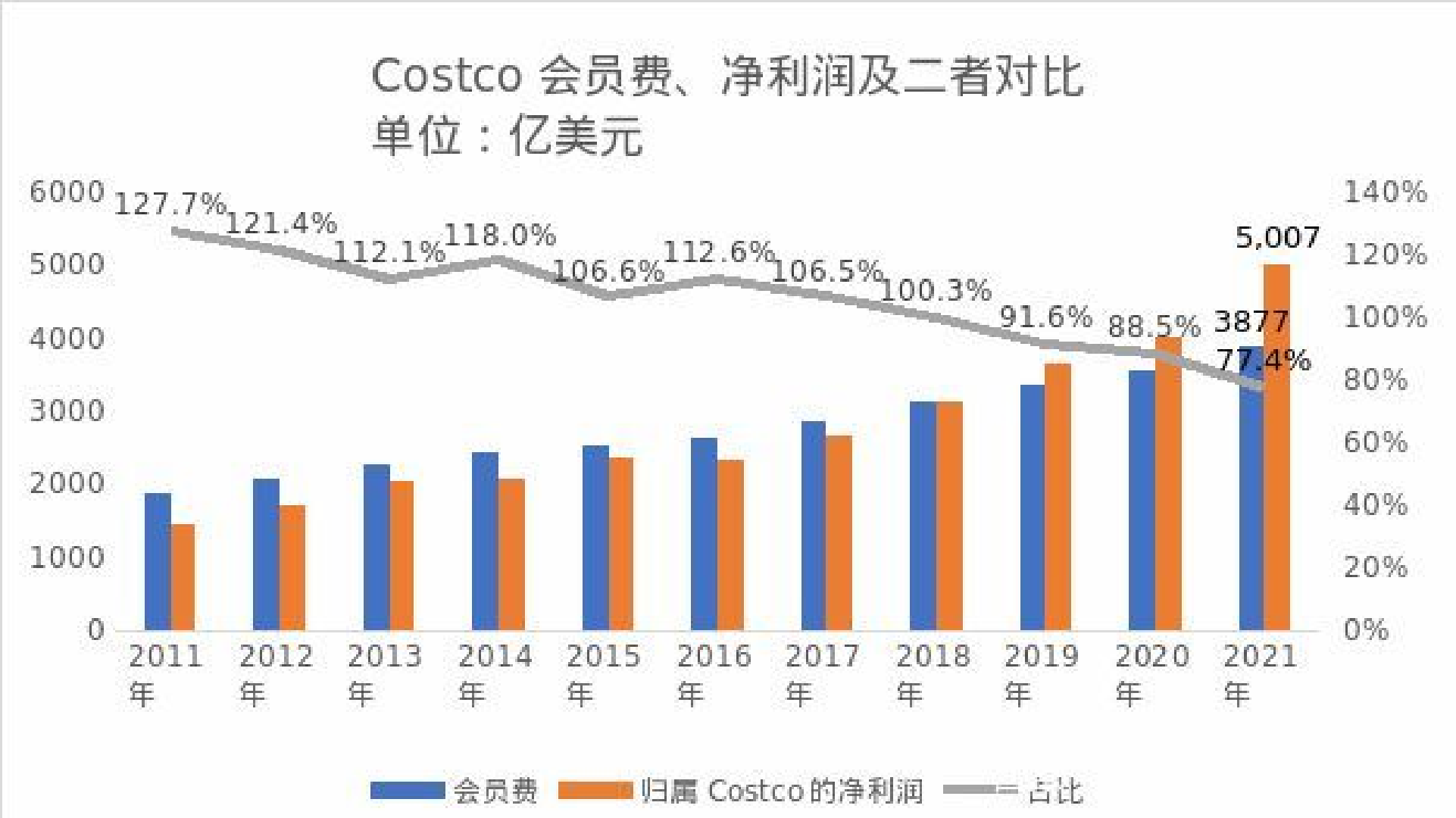 第二,也就是本小节的主题——订阅式会员所交的会员费,这一点也是大家所熟悉的,开市客超市通过销售的会员卡所得的收入。从开市客超市历年的营业收入数据我们可以看出来 ,会员费收入这部分几乎全是纯利润,而且有很高的续费率,这就是稳定的利润来源。我们经常说,一个商业模式漂不漂亮,就看它持续赚钱的能力强不强。显然,开市客的商业模式相当漂亮,相当有吸引力。