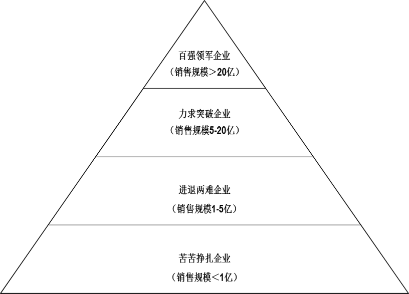 百强企业各有各的成功法门。齐鲁制药、正大天晴、恒瑞医药等依靠创新驱动战略,百强排名节节攀升;复星医药、远大集团、华润三九等通过资源、渠道、产品线等多元化并购战略,推动企业跨越式发展;华海、石药、海正药业等加速国际化布局,践行“走出去”的发展战略;步长制药、济民可信等依靠强大的自营体系,有效避开“两票制”压力,带来更多的业绩增长;吉林敖东药业、成都康弘药业等新晋企业在各自领域寻求创新突破,为企业发展带来新的增长点。企业分层如图2-1所示。