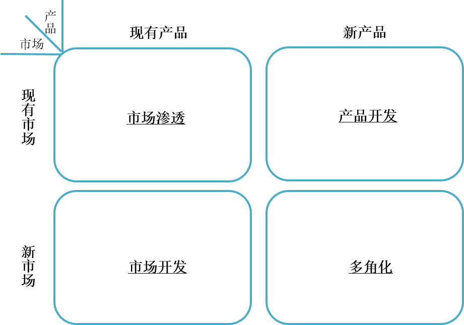 这一期间不能不提“战略之父”安索夫的贡献,他把公司战略的概念推向了管理实践的最前沿,提出了影响甚远的“安索夫矩阵”(后来增加了地理维度,模型更加完善),至今仍被广泛应用,如图2所示。