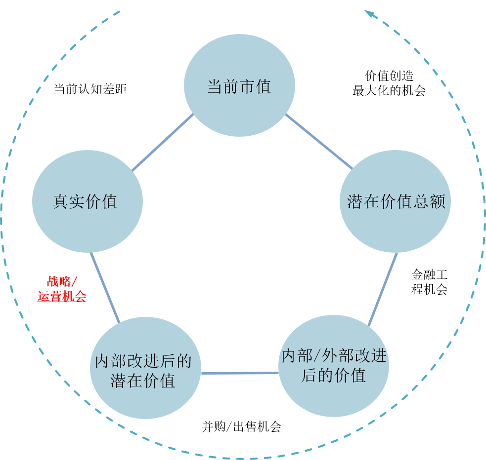 20世纪80年代,随着资本市场的发展,公司管理层日益关注资本市场对公司的估值。因此,为了向这些上市公司提供帮助,许多咨询公司逐步开发基于价值的管理方法,目的是为了使股东价值最大化。其中,最具影响力的是麦肯锡公司几位咨询顾问(外加一位沃顿商学院教授)提出的“价值管理五角图”(《价值评估:公司价值的衡量与管理》),把自由现金流作为公司业务取舍的重要依据,如图6所示。