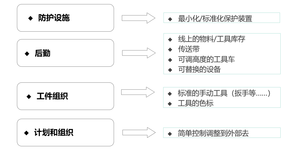 通过一系列的方式方法将内部作业、外部作业原来的方法进行优化(图3-19、表3-11),从而达到缩短内外部作业时间的目的。