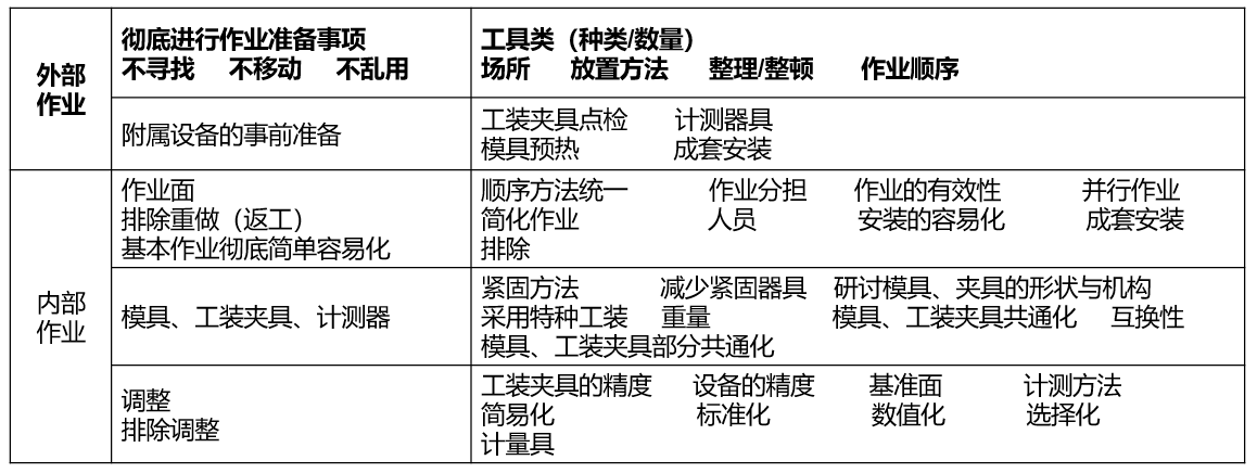 外部作业是指不需要设备或者机台停机就可以实施的作业内容,包括前外换模作业(换模前准备工作,如准备工具、模具、物料等)和后外换模作业(换模后的收尾工作,如现场清理、模具入库等)。