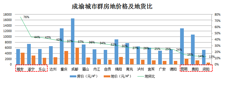成渝城市群房价平均涨幅为53%,地价平均涨幅为133%。房价涨幅高于城市群整体平均增幅的城市共有7个,分别为重庆、成都、贵阳、绵阳、眉山、昆明及宜宾;地价涨幅高于城市群整体平均增幅的城市共有8个,分别为乐山、遂宁、达州、德阳、雅安、成都、贵阳及重庆。