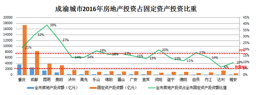 2016年成渝城市群房地产投资额为11087亿元(含贵阳及昆明),占全国房地产投资额135284亿元的8.2%;房地产投资额在均值404亿元以上的城市有4个,分别是重庆、成都、昆明及贵阳。房地产投资占固定资产投资比重超过25%的有3个,分别为昆明、成都、贵阳,此区域房地产投资相对过热,建议谨慎拿地;介于15%至25%的有6个,分别为重庆、资阳、乐山、眉山、自贡及绵阳,此区域为房地产合理投资区,建议重点关注;在15%以下的城市有9个,此区域房地产投资相对较少,存在潜在投资机会。