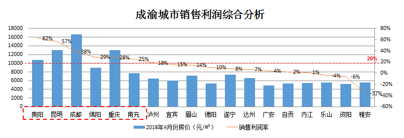 从销售利润率看,大于25%的城市有6个,为贵阳、昆明、成都、绵阳、重庆及南充,其余城市销售利润率均小于20%。