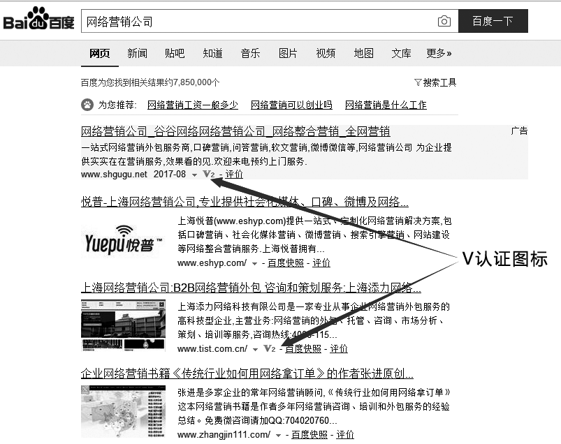 图3-2第一个网站是付费的广告,有V认证标识;第二个网站没有做过百度广告,只是自然排名在第一位,所以没有V认证;第三家是添力公司的网站,也有V认证标识(注:由于我们只在白天做广告,所以晚上虽然看不到我们的广告,但仍能在自然排名结果里看到我们做了V认证);第四个网站是我的个人博客,也是因为没有做过搜索推广,所以没有V认证。有人会注意到,在“网络营销公司”一词上,我公司的网站和我的个人博客分别自然排名在第二位和第三位,这也印证了我公司网站自然排名(SEO)的实力。如果你的网站也想有好的自然排名,请认真阅读第四章。