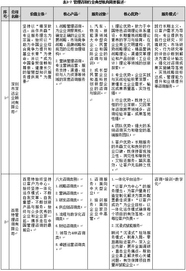 本报告中所指的“典型企业”是指知名度较高、创办时间长、商业信誉好、有发展潜力和综合实力强的企业,要求企业在咨询理论的独创性与特色性、咨询市场实践的影响力和自身信息化、数据化建设探索取得成效,具有行业先进性、示范性和代表性。我们在这里所介绍的典型企业,并不是什么全能冠军,也没有什么全能冠军,而是在不同服务板块或领域,某一个方面相对比较突出、比较专业的管理咨询企业。这样有特色的咨询和培训公司在行业健康发展中会发挥一定的“专精特新”带头作用。我们分别从价值主张、核心产品、服务对象、核心优势、服务模式五个方面对这14家典型管理咨询机构进行简要描述。如需进一步了解每一家典型咨询机构更详细的介绍,可以参见本书的附录一。